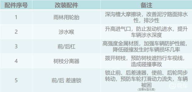 轮胎需要更换为MT胎或者“雨林胎”,让“大花纹”为车轮提升附着力,即使深陷泥沼也能成功脱困;加装涉水喉,让进气位置更高,轻松挑战深潭,不惧深水考验;经过强化的“犀牛杠”强度更高,在攀爬岩石、小路穿行过程中,能够减轻岩石、树枝磕碰对车身的伤害;树枝分离器,能够拨开车前挡在风挡玻璃前面的树枝,确保视线良好。多项细节改装,将让BJ40致敬2020版在雨林中发挥出最极致的越野实力。